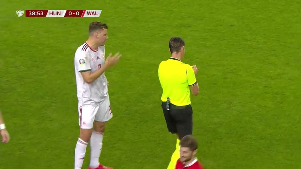 Tarjeta amarilla. El árbitro amonesta a Máté Pátkai de Hungary on June 11, 2019