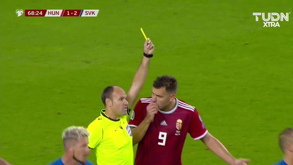 Tarjeta amarilla. El árbitro amonesta a Máté Pátkai de Hungary on September 9, 2019