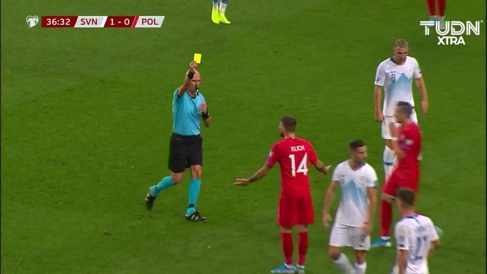 Tarjeta amarilla. El árbitro amonesta a Mateusz Klich de Poland
