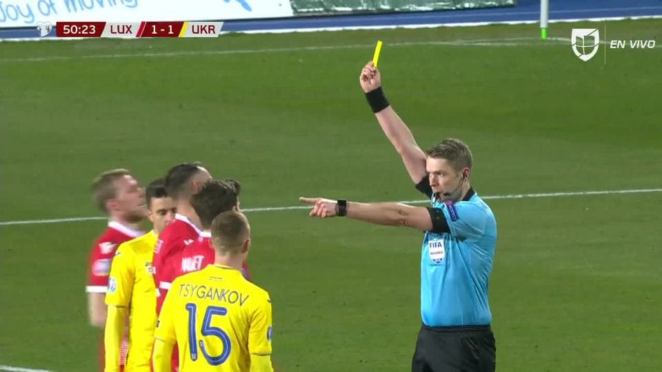 Tarjeta amarilla. El árbitro amonesta a Maxime Chanot de Luxembourg