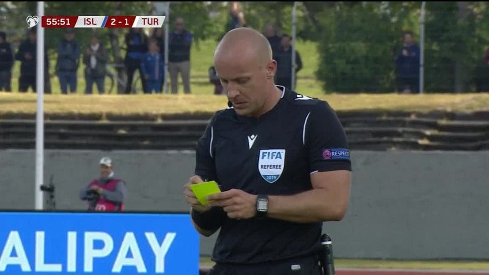 Tarjeta amarilla. El árbitro amonesta a Mehmet Zeki Çelik de Turkey on June 11, 2019