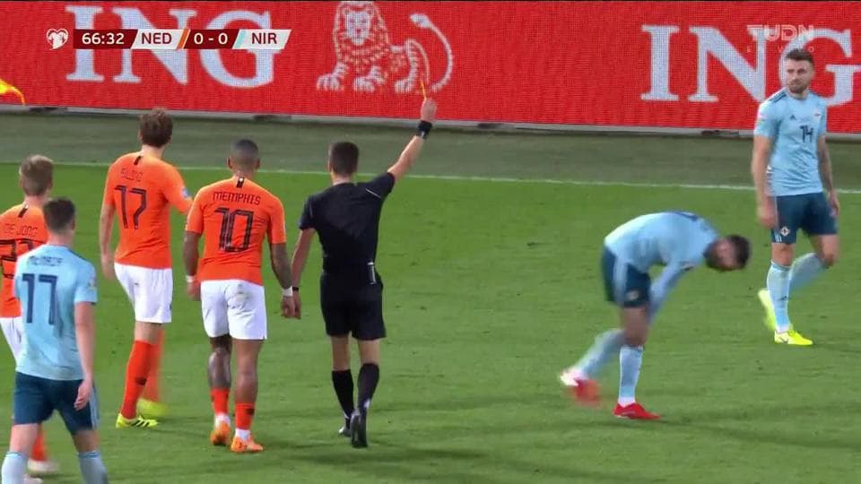 Tarjeta amarilla. El árbitro amonesta a Michael Smith de Northern Ireland on October 10, 2019