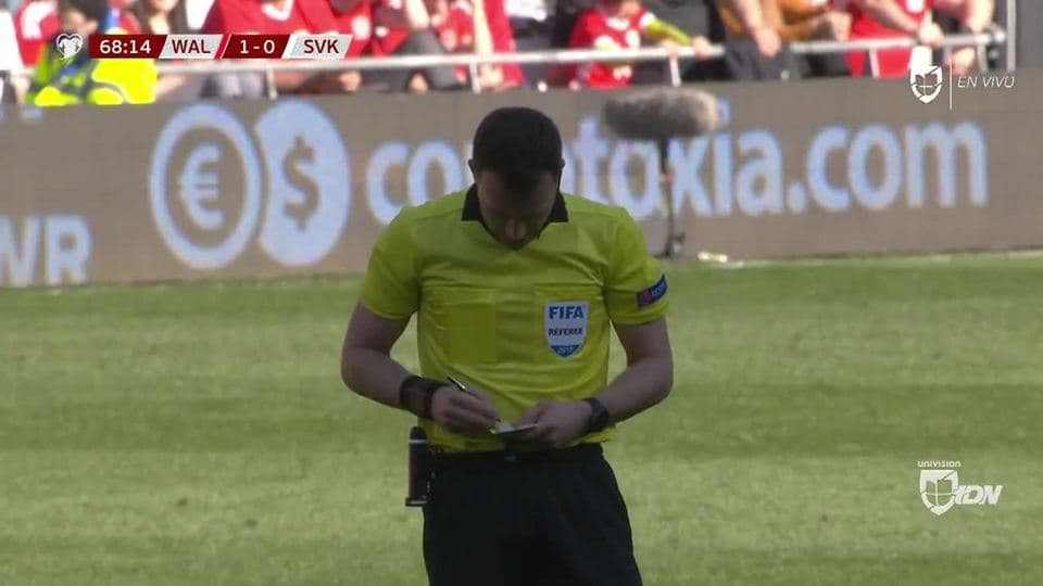 Tarjeta amarilla. El árbitro amonesta a Michal Duris de Slovakia