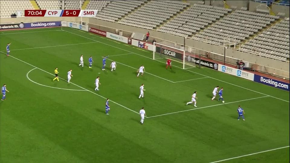 Tarjeta amarilla. El árbitro amonesta a Mirko Palazzi de San Marino