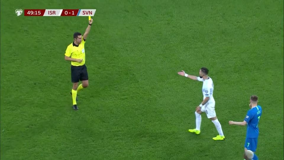 Tarjeta amarilla. El árbitro amonesta a Munas Dabbur de Israel on March 21, 2019