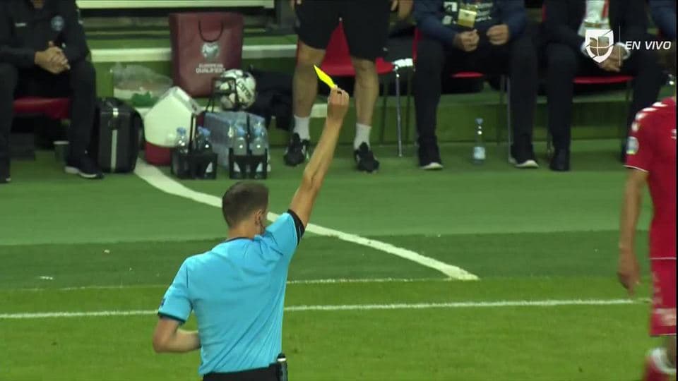 Tarjeta amarilla. El árbitro amonesta a Nika Kvekveskiri de Georgia on June 10, 2019
