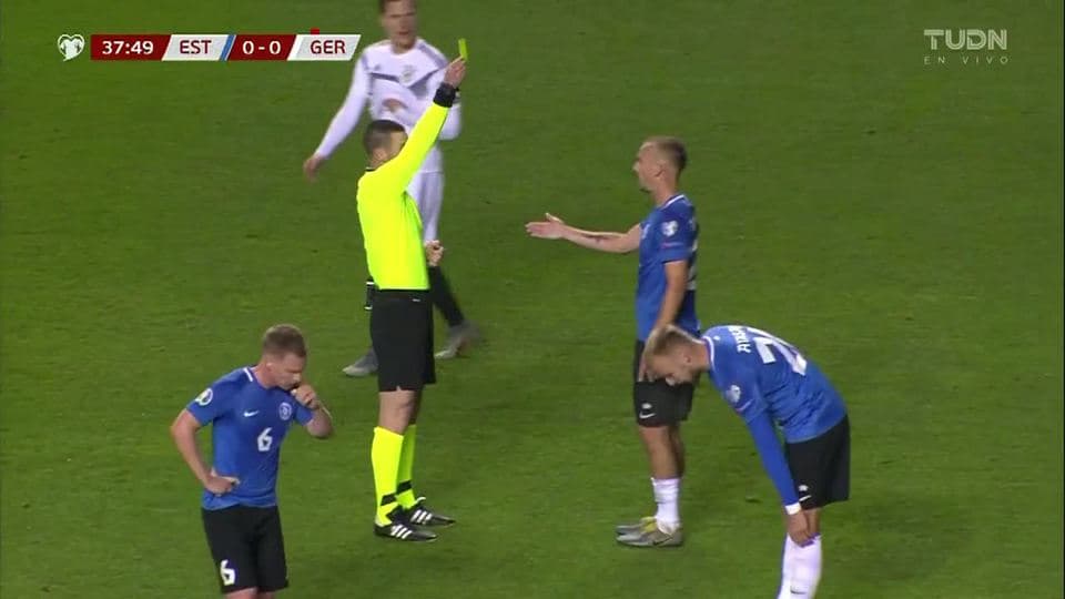 Tarjeta amarilla. El árbitro amonesta a Nikita Baranov de Estonia