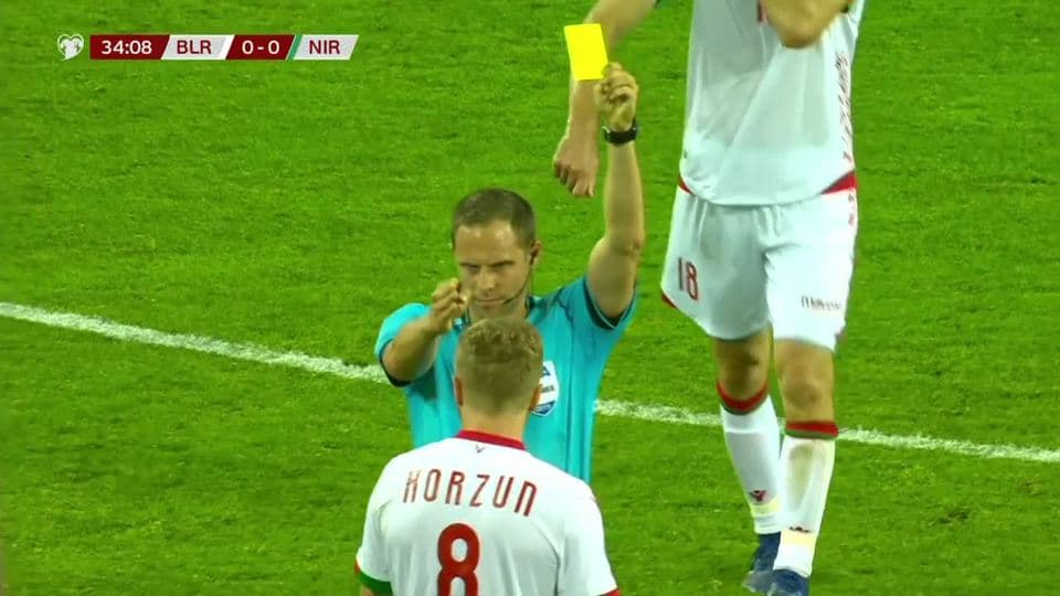 Tarjeta amarilla. El árbitro amonesta a Nikita Korzun de Belarus on June 11, 2019