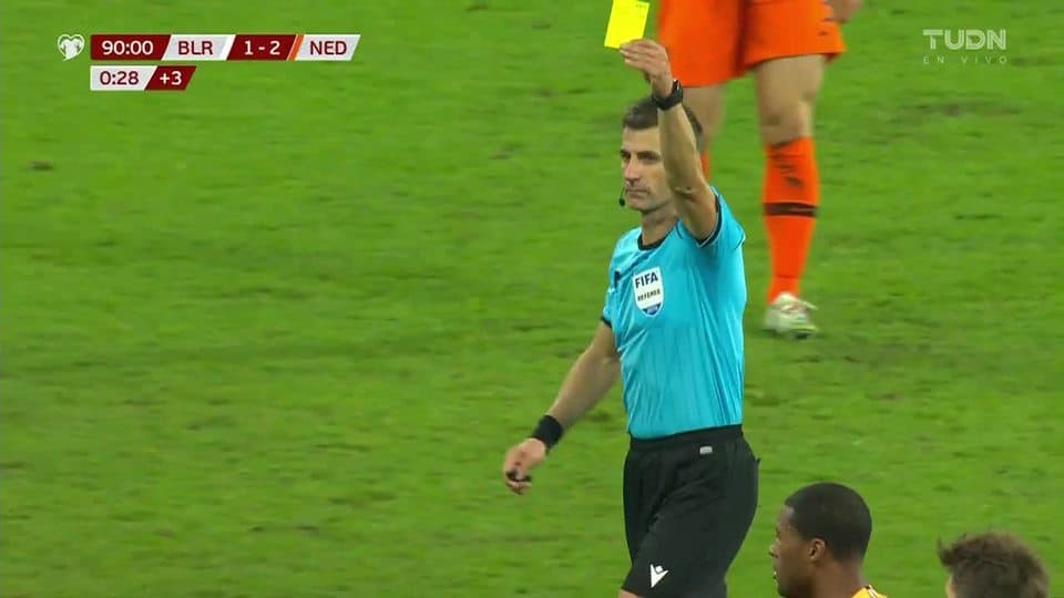 Tarjeta amarilla. El árbitro amonesta a Nikita Naumov de Belarus