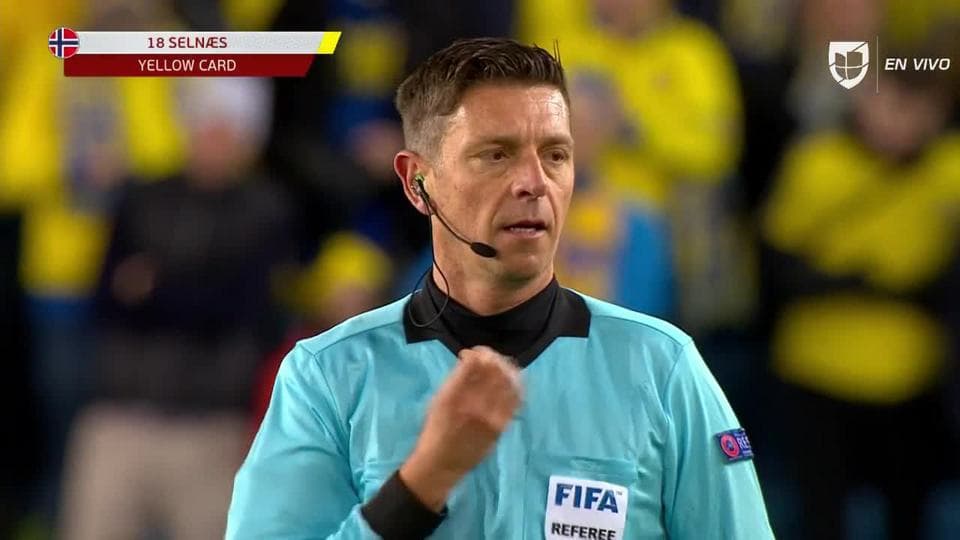 Tarjeta amarilla. El árbitro amonesta a Ole Selnaes de Norway on March 26, 2019