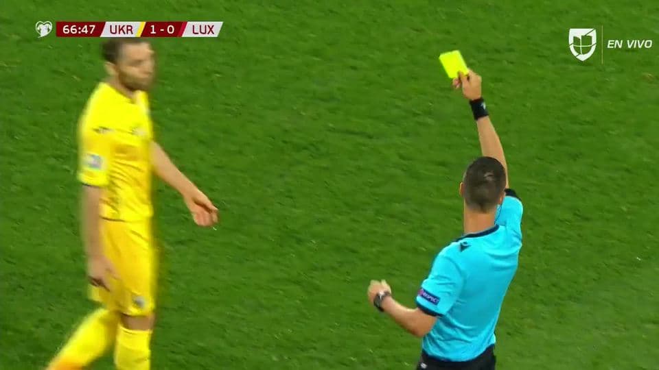 Tarjeta amarilla. El árbitro amonesta a Oleksandr Karavaev de Ukraine