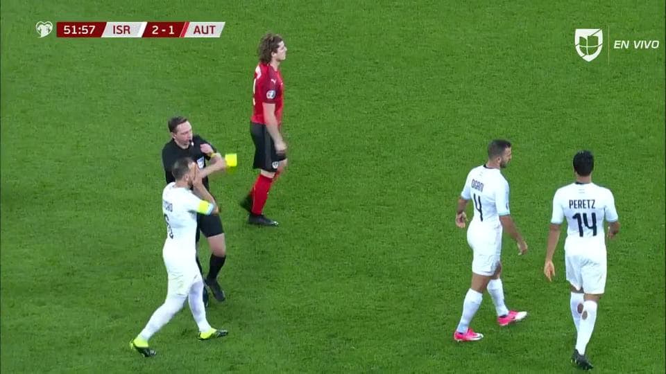 Tarjeta amarilla. El árbitro amonesta a Orel Dgani de Israel