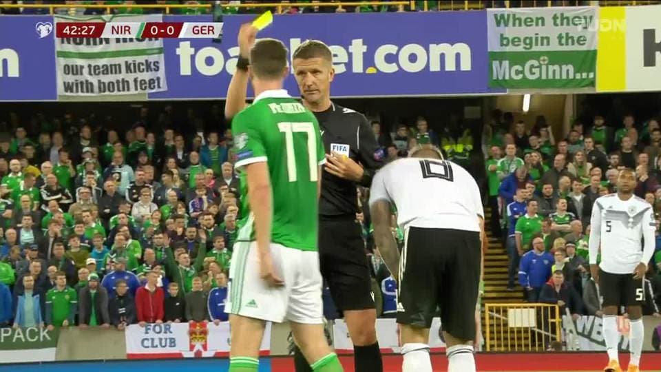 Tarjeta amarilla. El árbitro amonesta a Patrick McNair de Northern Ireland