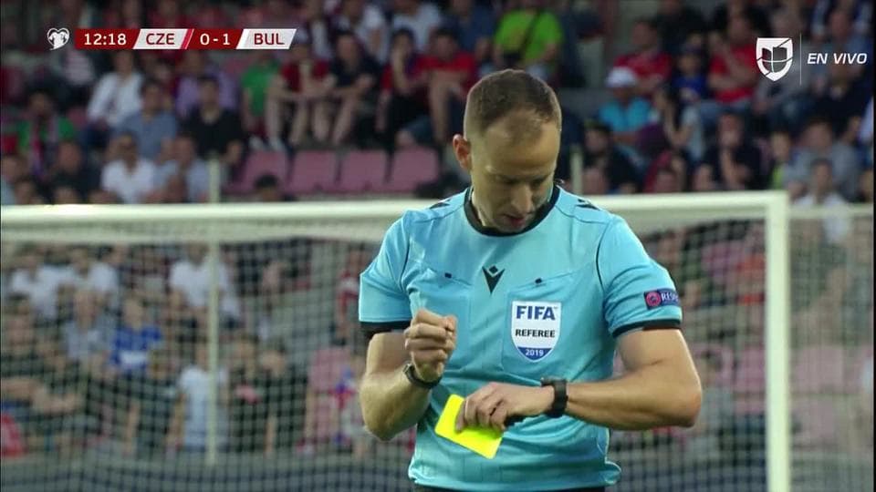Tarjeta amarilla. El árbitro amonesta a Pavel Kaderábek de Czech Republic on June 7, 2019