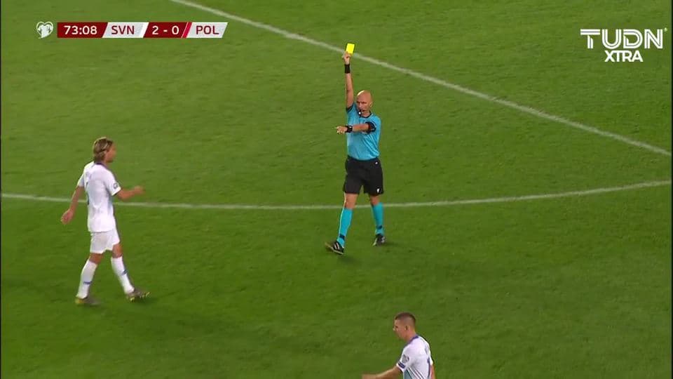 Tarjeta amarilla. El árbitro amonesta a Petar Stojanovic de Slovenia