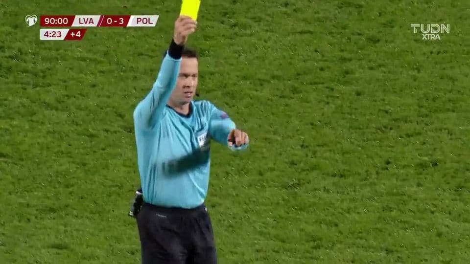 Tarjeta amarilla. El árbitro amonesta a ${PLAYER} de Latvia