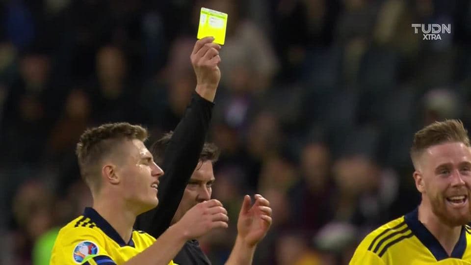 Tarjeta amarilla. El árbitro amonesta a Pontus Jansson de Sweden on November 18, 2019