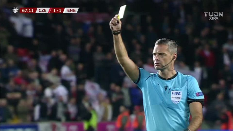 Tarjeta amarilla. El árbitro amonesta a Raheem Sterling de England