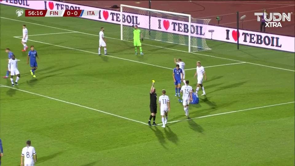 Tarjeta amarilla. El árbitro amonesta a Rasmus Schüller de Finland on September 8, 2019