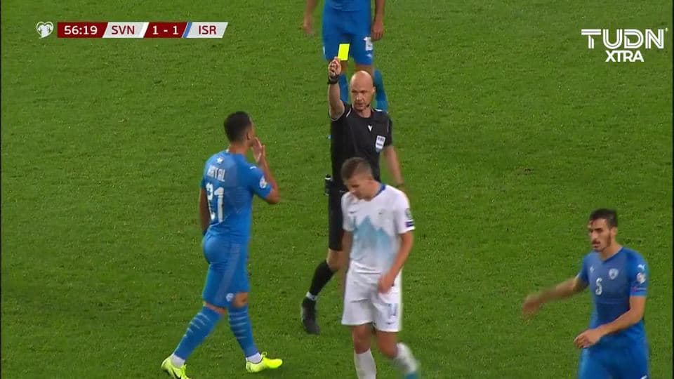 Tarjeta amarilla. El árbitro amonesta a Roman Bezjak de Slovenia on September 9, 2019
