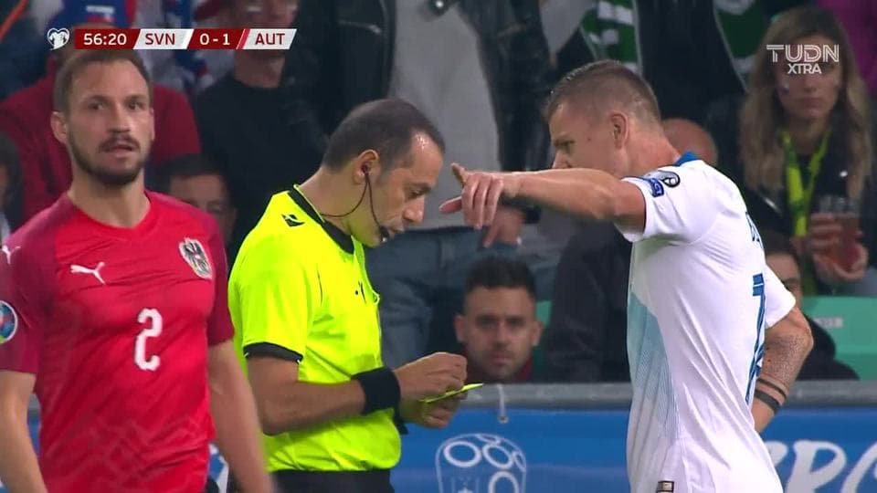 Tarjeta amarilla. El árbitro amonesta a Roman Bezjak de Slovenia on October 13, 2019