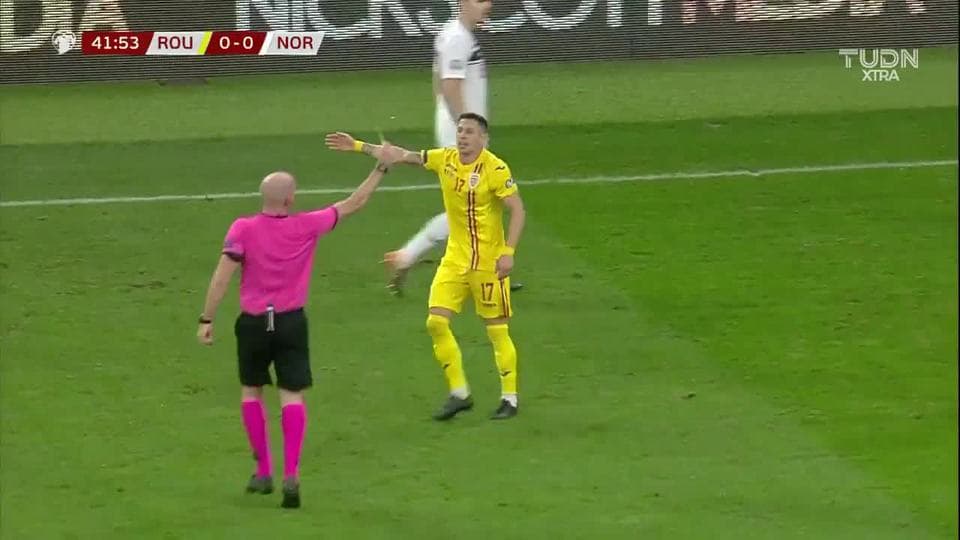 Tarjeta amarilla. El árbitro amonesta a Romario Benzar de Romania