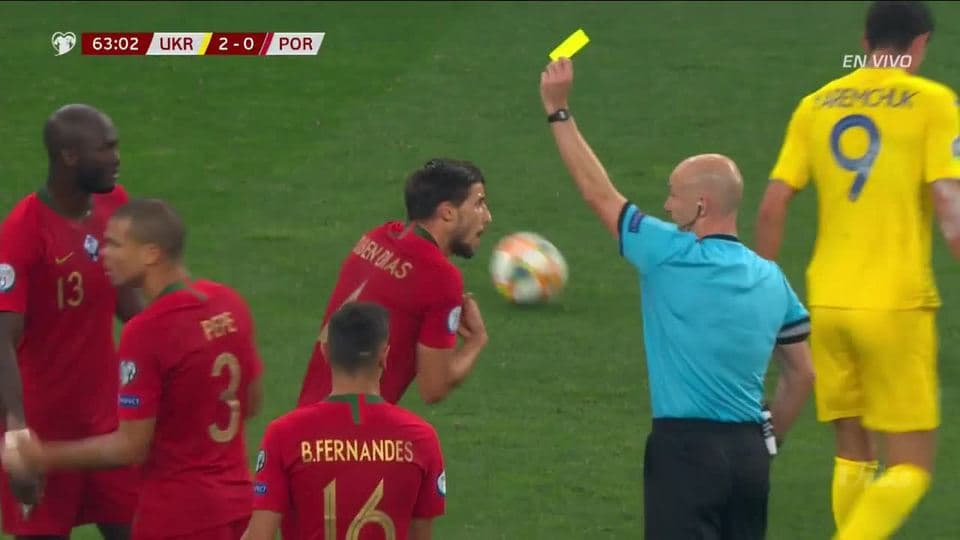 Tarjeta amarilla. El árbitro amonesta a Rúben Dias de Portugal on October 14, 2019