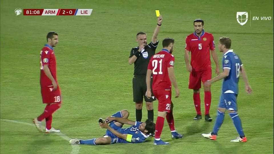 Tarjeta amarilla. El árbitro amonesta a Rumyan Hovsepyan de Armenia on June 8, 2019