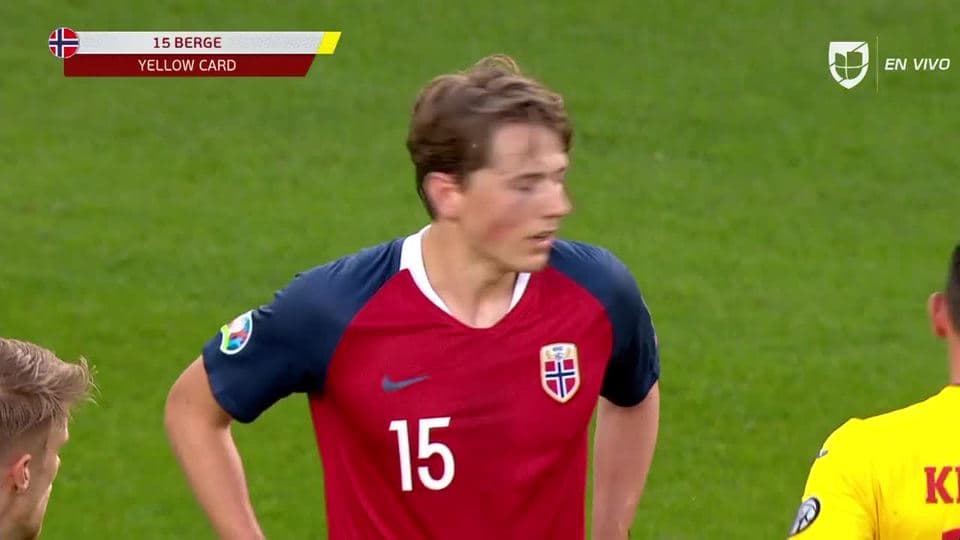 Tarjeta amarilla. El árbitro amonesta a Sander Berge de Norway
