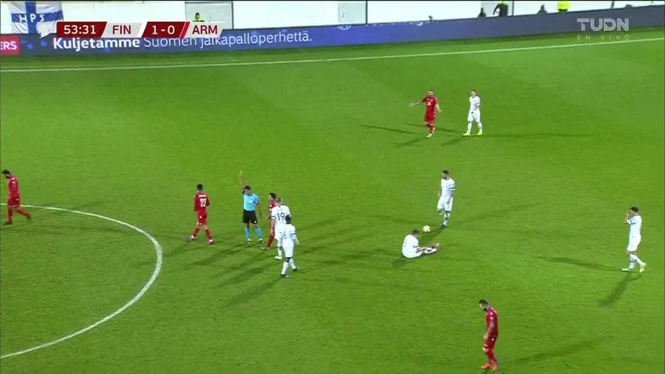 Tarjeta amarilla. El árbitro amonesta a Sargis Adamyan de Armenia