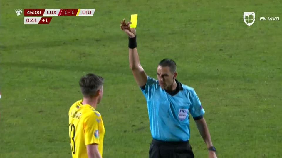 Tarjeta amarilla. El árbitro amonesta a Saulius Mikoliunas de Lithuania