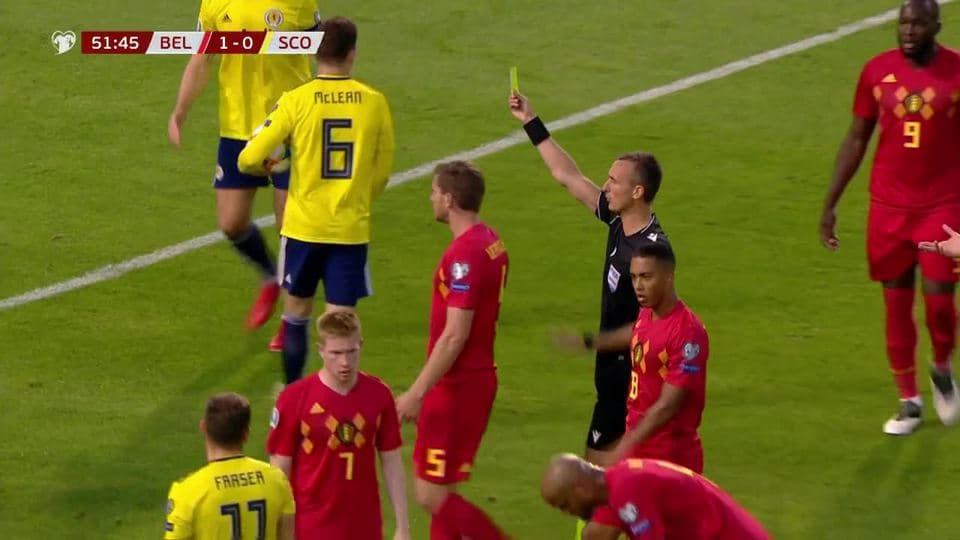 Tarjeta amarilla. El árbitro amonesta a Scott McTominay de Scotland on June 11, 2019