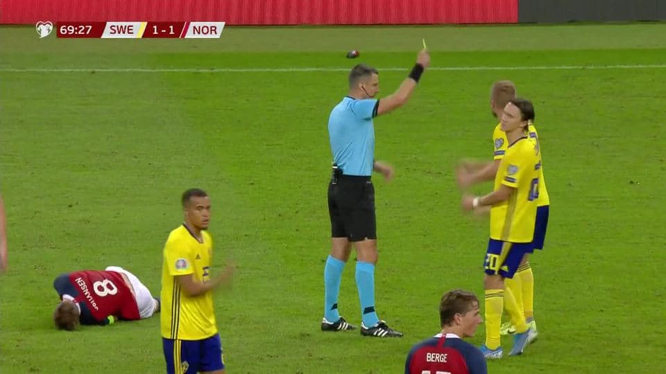 Tarjeta amarilla. El árbitro amonesta a Sebastian Larsson de Sweden on September 8, 2019