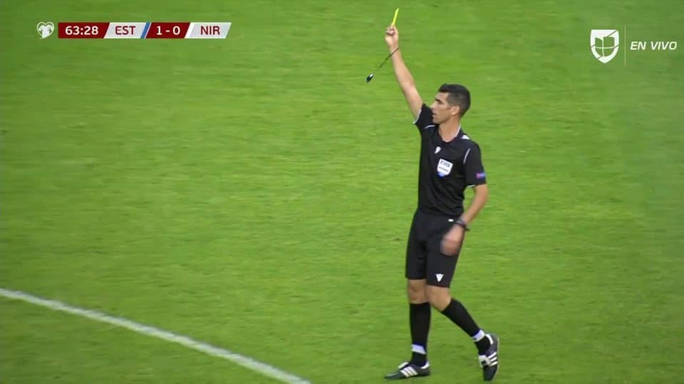 Tarjeta amarilla. El árbitro amonesta a Sergei Lepmets de Estonia on June 8, 2019