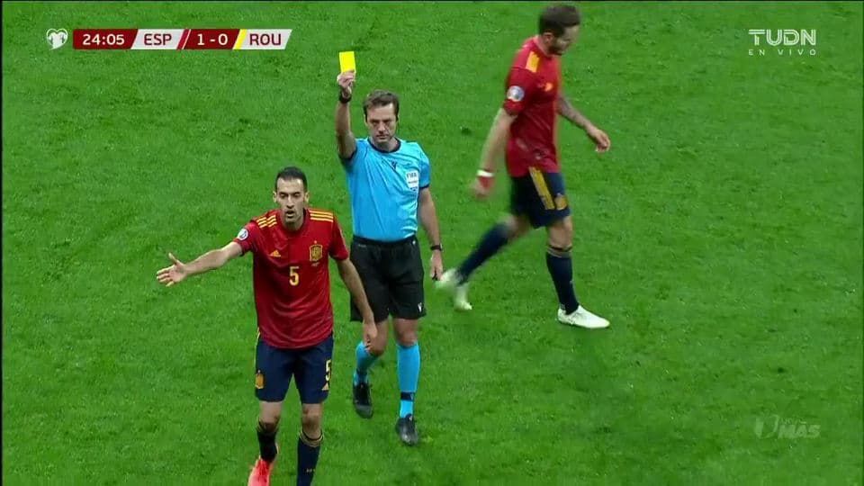 Tarjeta amarilla. El árbitro amonesta a Sergio Busquets de Spain