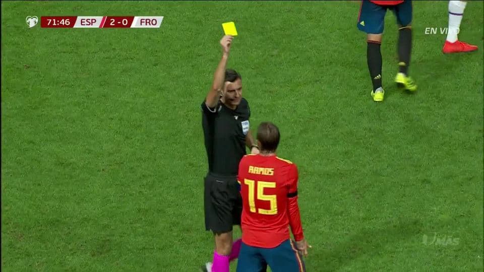 Tarjeta amarilla. El árbitro amonesta a Sergio Ramos de Spain on September 8, 2019
