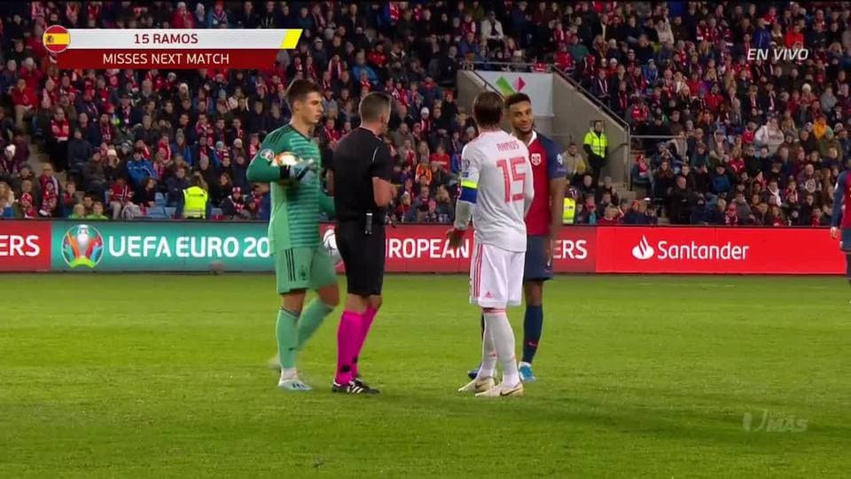 Tarjeta amarilla. El árbitro amonesta a Sergio Ramos de Spain on October 12, 2019