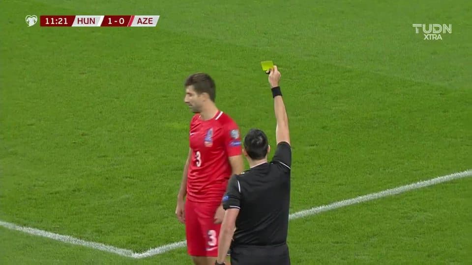 Tarjeta amarilla. El árbitro amonesta a Shahriyar Rahimov de Azerbaijan