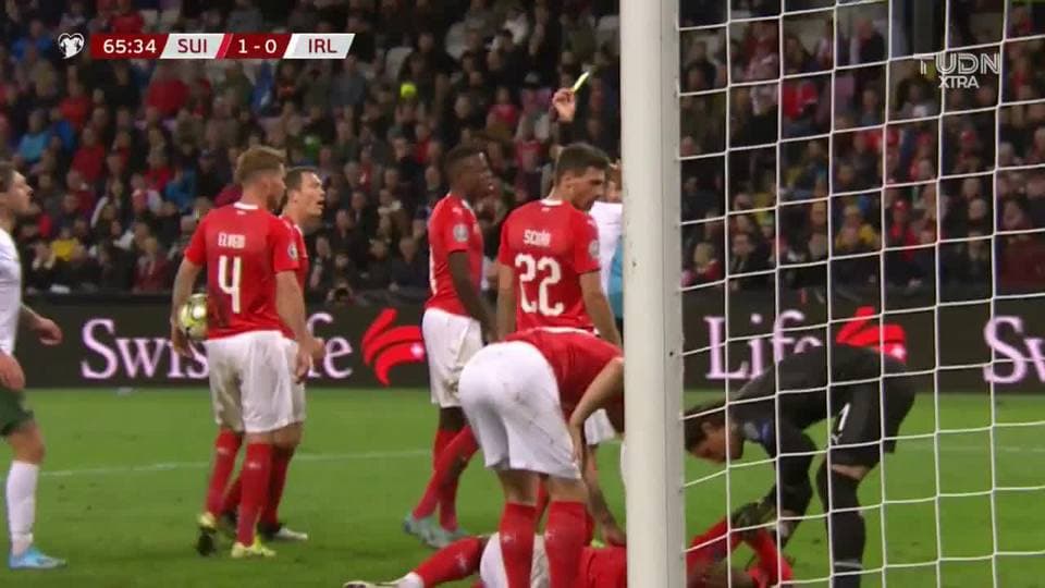 Tarjeta amarilla. El árbitro amonesta a Shane Duffy de Republic of Ireland