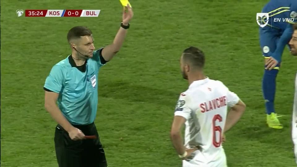 Tarjeta amarilla. El árbitro amonesta a Simeon Slavchev de Bulgaria
