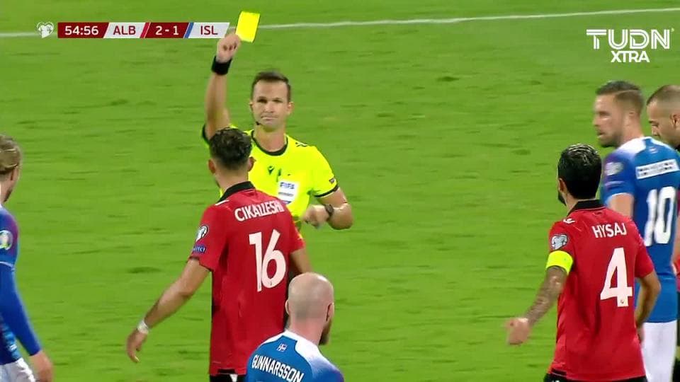 Tarjeta amarilla. El árbitro amonesta a Sokol Cikalleshi de Albania
