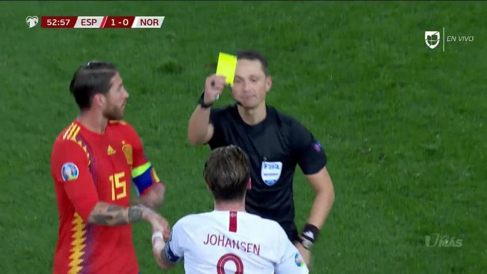 Tarjeta amarilla. El árbitro amonesta a Stefan Johansen de Norway on March 23, 2019