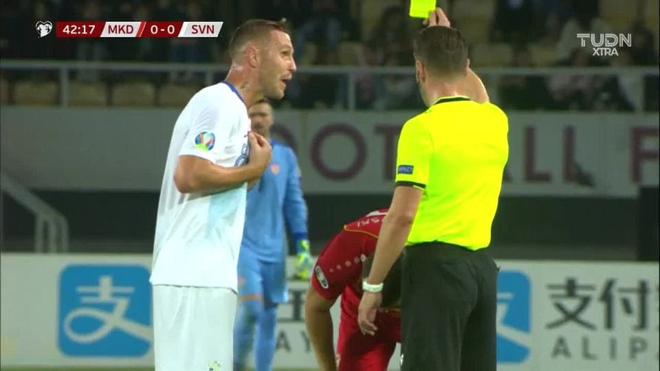 Tarjeta amarilla. El árbitro amonesta a Stefan Ristovski de North Macedonia on October 10, 2019