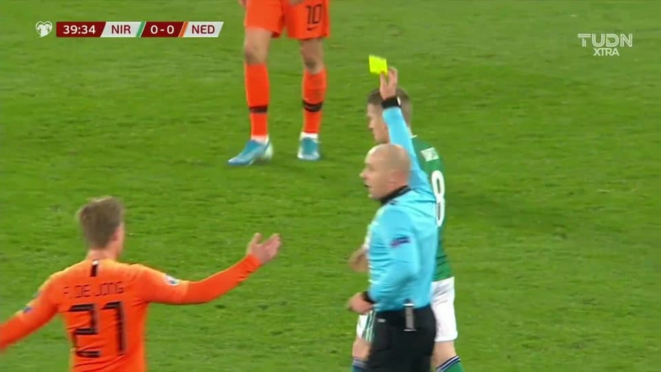 Tarjeta amarilla. El árbitro amonesta a Steven Davis de Northern Ireland on November 16, 2019