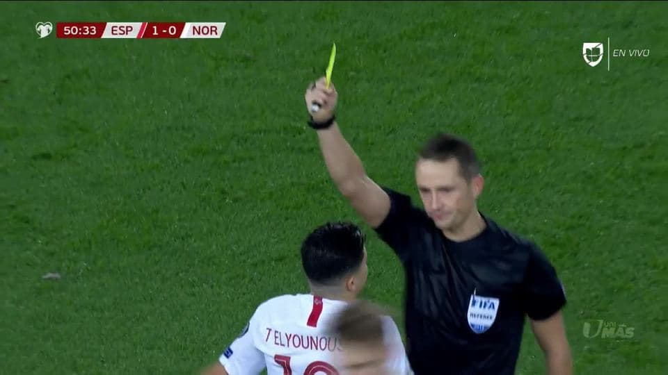 Tarjeta amarilla. El árbitro amonesta a Tarik Elyounoussi de Norway on March 23, 2019