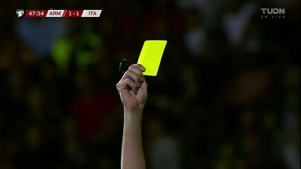 Tarjeta amarilla. El árbitro amonesta a Tigran Barseghyan de Armenia on September 5, 2019