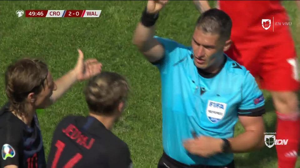 Tarjeta amarilla. El árbitro amonesta a Tin Jedvaj de Croatia on June 8, 2019