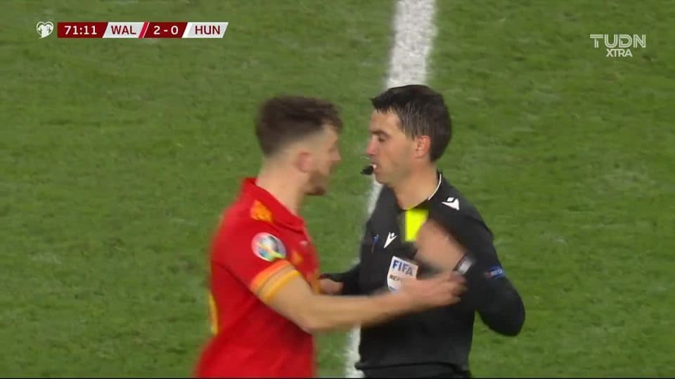 Tarjeta amarilla. El árbitro amonesta a Tom Lockyer de Wales