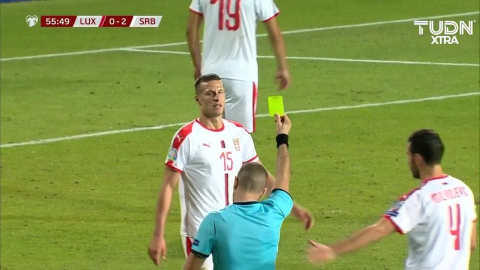 Tarjeta amarilla. El árbitro amonesta a Uros Spajic de Serbia on September 10, 2019
