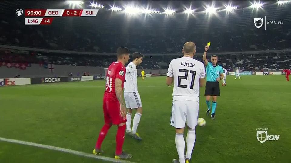 Tarjeta amarilla. El árbitro amonesta a Valeriane Gvilia de Georgia